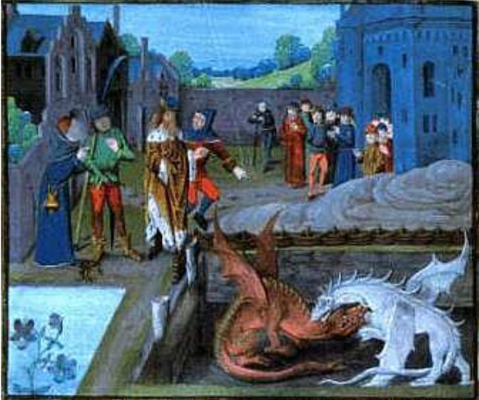 As the story goes on, Vortigern is afraid that Pendragon and Uther, the rightful heirs to the throne, are going to come back and overthrow him. He’s trying to build a tower to keep himself safe, but it keeps falling. He calls Merlin for help. So this is when these two stories come together, as Merlin joins Vortigern. Merlin reveals that there are two dragons under the tower, and they dig them up and the dragons have a huge fight. One of these dragons is red, and this becomes the red dragon that we still see on the flag of Wales today. That flag refers to this legend.